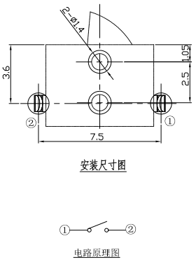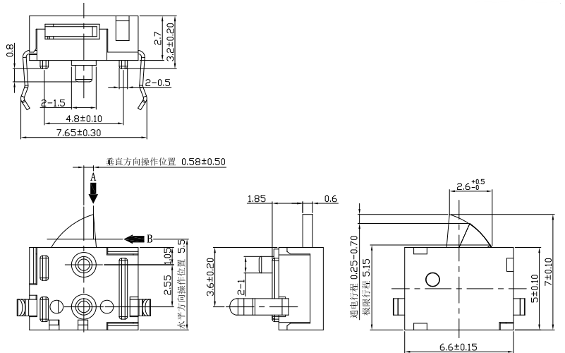 開關總高5.2mm;通電行程0.30~0.80mm;操作開關極限時高3.55mm;