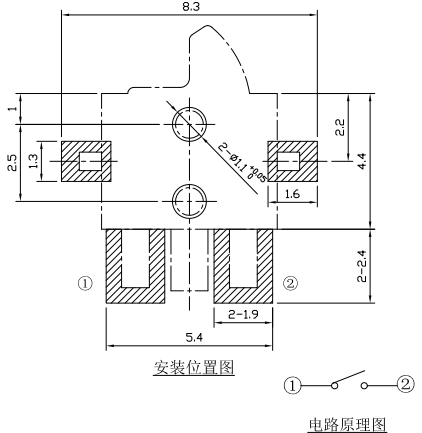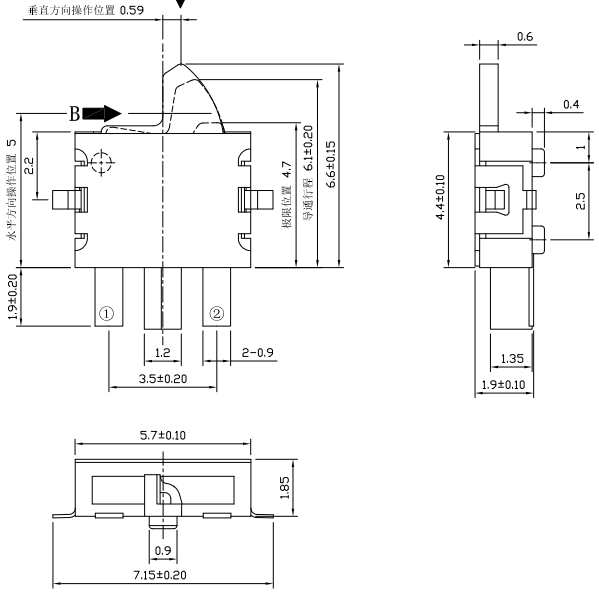 開關總高6.6mm;開關導通時高6.1±0.2;操作開關極限時高4.7